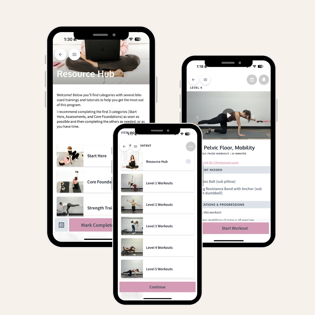 Resource Hub with short educational modules to help you understand warning signs, connect to your core and pelvic floor, troubleshoot pain/symptoms, learn c-section scar massage, and more!